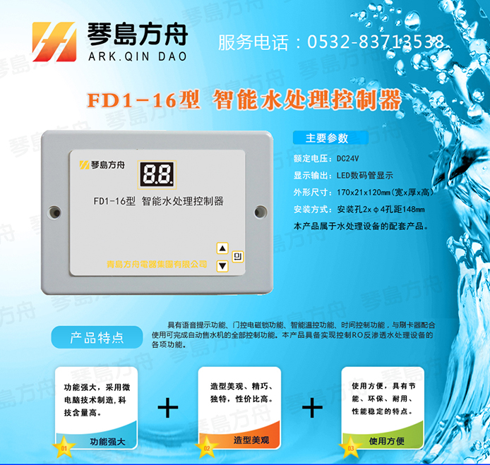 具有語(yǔ)音提示功能、門(mén)控電磁鎖功能、智能溫控功能、時(shí)間控制功能與刷卡器配臺(tái)使用可完成自售水機(jī)的全部控制功能。本產(chǎn)品具備實(shí)現(xiàn)控制RO反滲透水處理設(shè)備的各項(xiàng)功能。