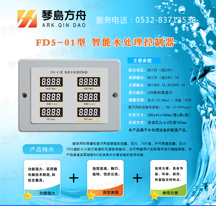 能夠同時(shí)測(cè)量和顯示兩路管路的流量,壓力、TDS值,并可根據(jù)流量、壓力、TDS值的大小進(jìn)行有源和無(wú)源控制輸出,也可根據(jù)用戶實(shí)際需求進(jìn)行編程調(diào)整。本產(chǎn)品具備實(shí)現(xiàn)控制RO反滲透水處理設(shè)備的各項(xiàng)功能。