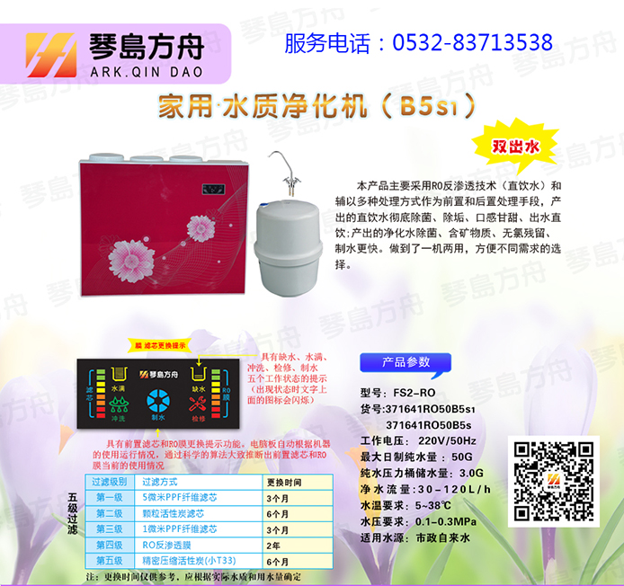 家用·水質(zhì)凈化機(jī)(B5s1紅色) 雙出水,本產(chǎn)品主要采用RO反滲透技術(shù)(直飲水)和輔以多種處理方式作為前置和后置處理手段,產(chǎn)出的直飲水徹底除菌、除垢、口感甘甜、出水直飲;產(chǎn)出的凈化水除菌、含礦物質(zhì)、無抓殘留、制水更快。做到了一機(jī)兩用.方便不同需求的選擇。